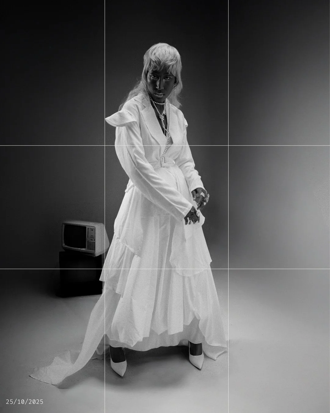 Archangel examines how personality and presence shape the way an outfit is perceived. Cassien inhabits the frame with poise, tension, and motion, moving between commanding stances and subtle gestures. Against stark, dark backgrounds, the flowing white dress interacts with her movements, creating moments of stillness and blur, drama and elegance, capturing the tension between form and motion.